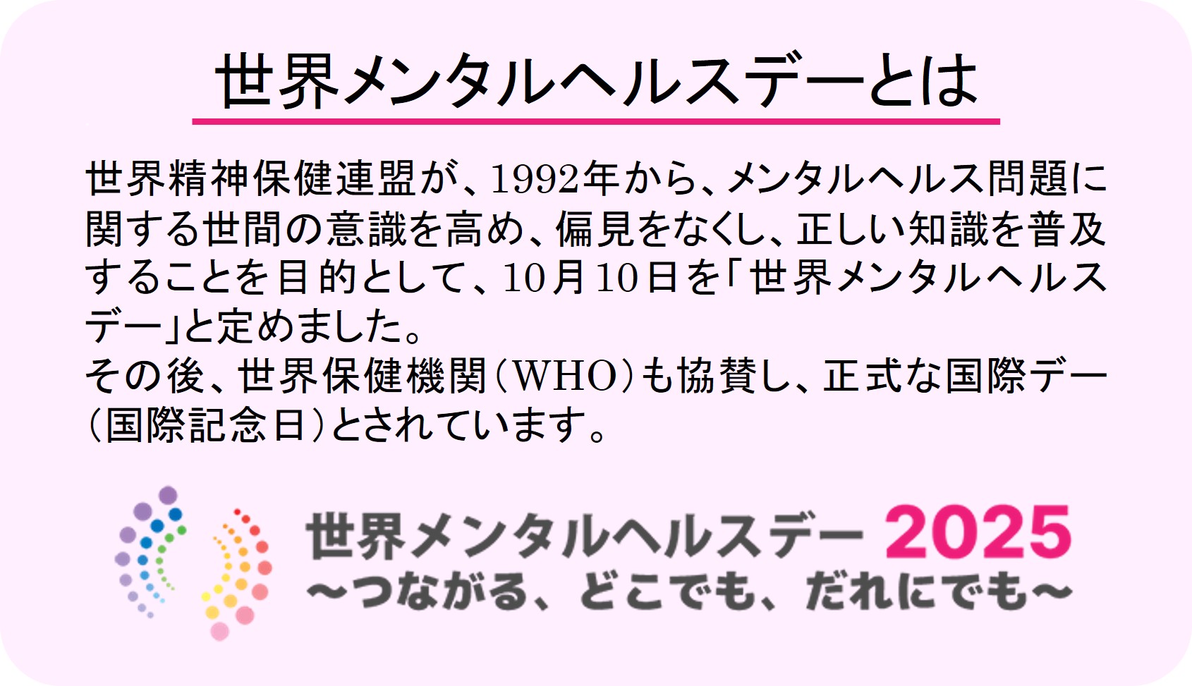 毎年10月10日は「世界メンタルヘルスデー」です。現代社会では、仕事や人間関係などで知らず知らずのうちにストレスを抱えがちですが、健康に生きるためには、心の状態にも意識を向けることが大切です。