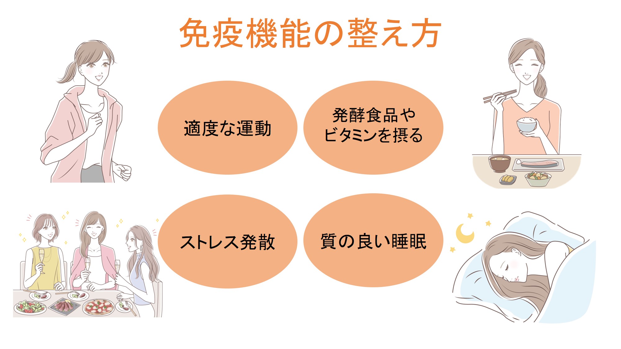 免疫細胞の約7割は腸に存在するといわれています。発酵食品(味噌・ヨーグルト・納豆など)を日常的に摂ることで腸内環境が整い、免疫機能の維持・調整をサポートすることが期待されます。また、ビタミンC、ビタミンD、亜鉛などの栄養素も、免疫機能の維持に効果的です。加えて、質の良い睡眠と適度な運動、ストレスをため込まない生活も心がけたいところです。
